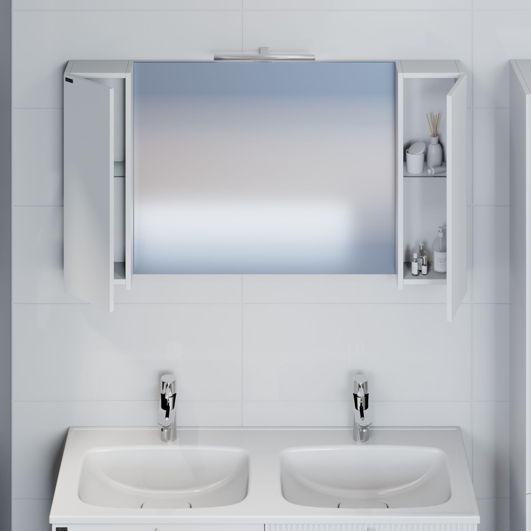 Коллекция мебели для ванной комнаты Санта Вега — это современное решение для вашей ванной комнаты. Фасады и боковины выполнены из МДФ и покрыты глянцевой эмалью. Дверцы оснащены петлями плавного закрывания. Один фасад зеркального шкафа выполнен с вертикальной реечной фрезеровкой, второй покрыт белой глянцевой эмалью. В комплектацию входит светильник, который можно подключить к внешней проводке ванной комнаты, выключатель в комплектацию не входит.