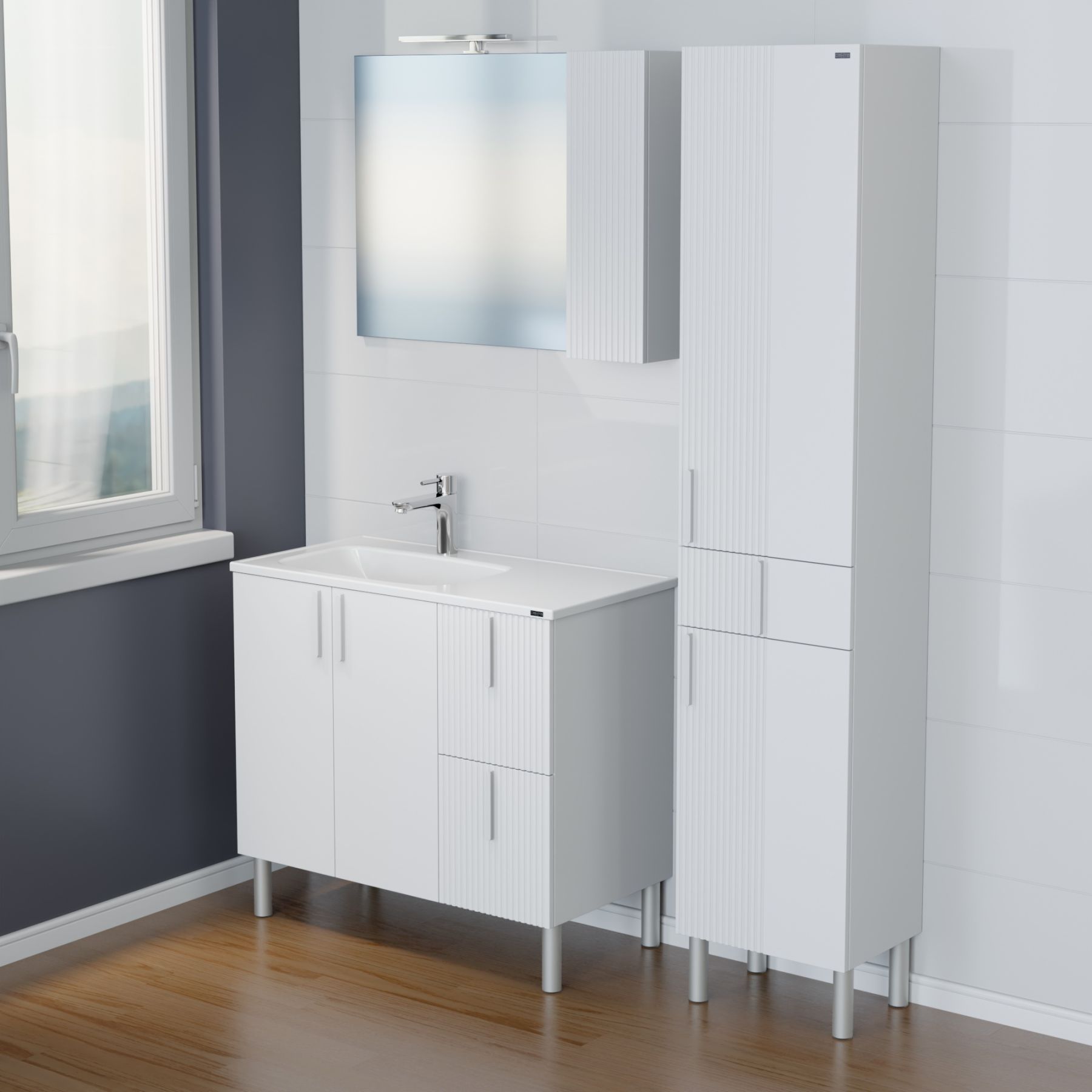 Коллекция мебели для ванной комнты Санта Вега — это современное решение для вашей ванной комнаты. Фасады и боковины выполнены из МДФ и покрыты глянцевой эмалью. Дверцы оснащены петлями плавного закрывания. Фасад зеркального шкафа выполнен с вертикальной реечной фрезеровкой.